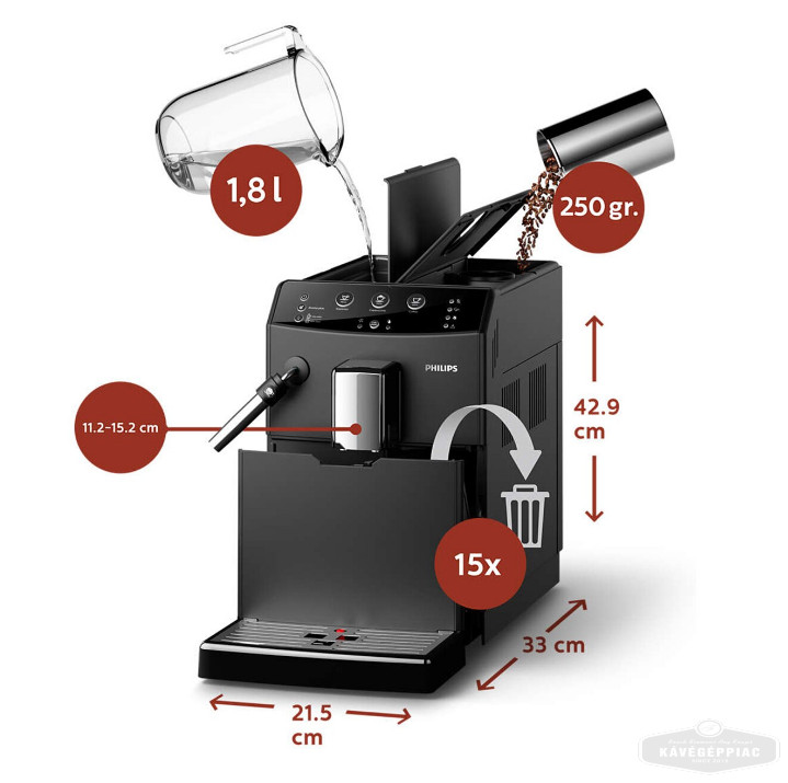 Kompakt kialakításban maximalizált teljesítmény Élvezze a nagyobb helyet, valamint azt, hogy a nagy kapacitású, rendkívül praktikus kialakítású kávészem-, víz- és hulladéktartályok sokkal tovább bírják a következő feltöltésig. Ez az intelligens, automata kávéfőző nagy kapacitású víztartályával, kávészemtartójával és hulladéktartályával maximális kényelmet és csúcsminőségű teljesítményt nyújt. |